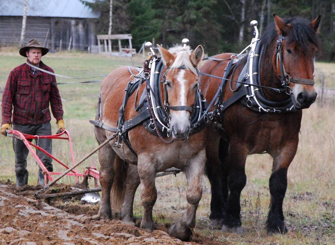 Mies kyntää peltoa hevosilla. Parivaljakko