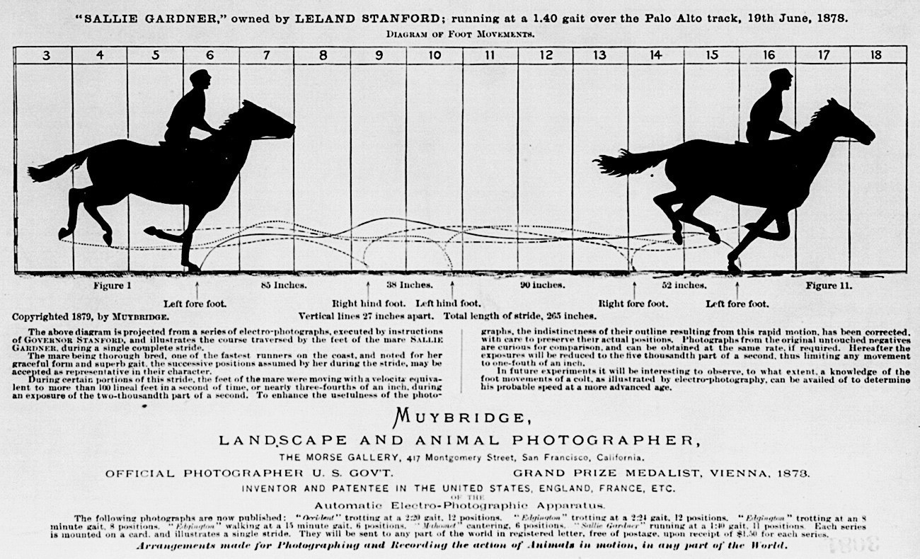 Artikkelikuva: Title: The horse in motion, illus. by Muybridge. ”Sallie Gardner,” owned by Leland Stanford, running at a 1:40 gait over the Palo Alto track, 19 June 1878: 2 frames showing diagram of foot movements (Linkki)