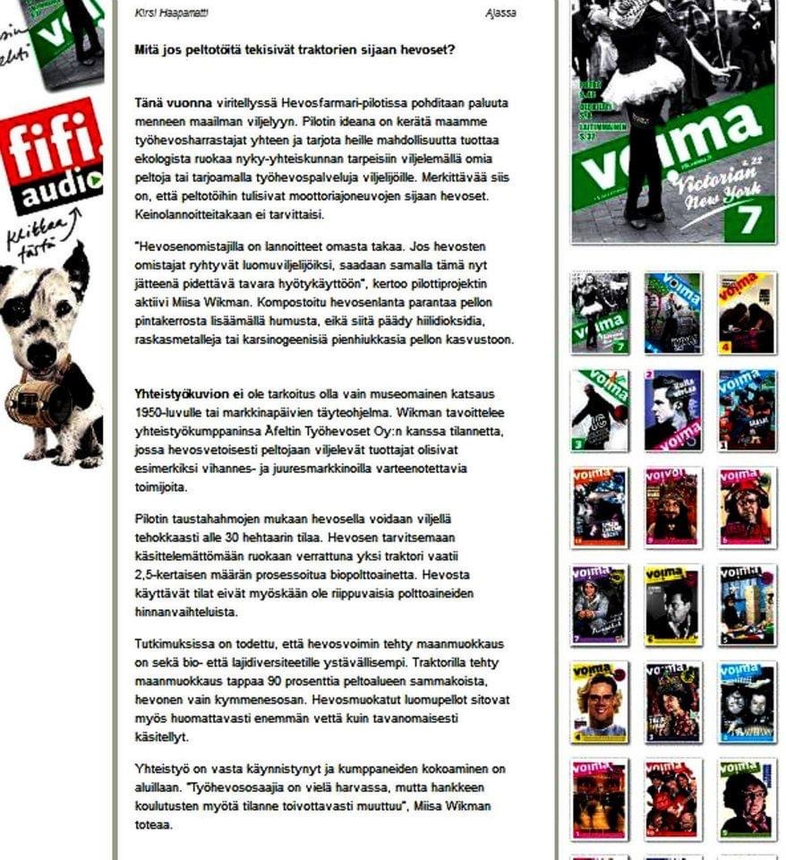 Työhevosharrastaja Miisa Wikman on Pirkanmaan seudulta ponnistavan Hevosfarmari-kokeilun aktiivi. Juuri hän innosti Miika Åfeltin mukaan. Toistaiseksi Åfelt on ainoa hevosfarmari, sillä vanhat hevosmiestaidot ovat katoamassa.