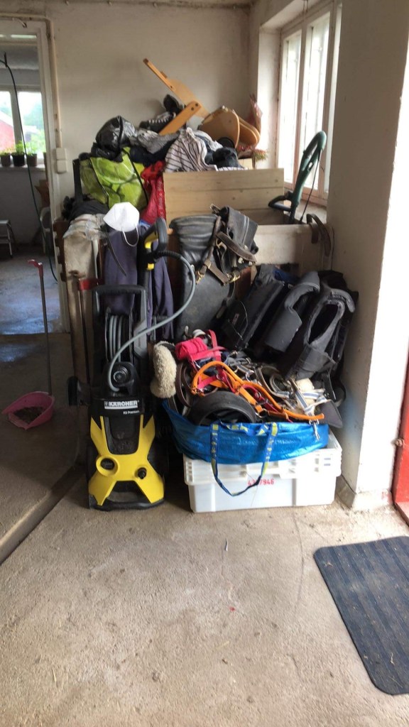 Tämän sanottuani, tyhjäsin valjashuoneen alkukesästä ja keräsin valtavan kasan myyntiin meneviä hevosvarusteita. Olen melko peruslaiska varusteiden suhteen, enkä jaksa säätää ylimääräisten remmien ja suojien kanssa jos niille ei ole tarvetta. Silti se myyntiin menevä kasa oli todella suuri. Ja silti valjashuoneeseen tarvitsi tehdä lisää seinätilaa että sain kaikki varusteet mahtumaan siististi. Eli tarvitsi niitä tavaroita tai ei, kummasti niitä vain tuntuu kertyvän. Myyntiin menevässä kasassa oli aika paljon varusteita joita on ehkä kerran koitettu tai pari kertaa pidetty, että tiedä sitten säästyykö sitä rahaa vaikka ei niin kamalasti ylimääräisiä varusteita hevosilla käyttäisi 😃🫣